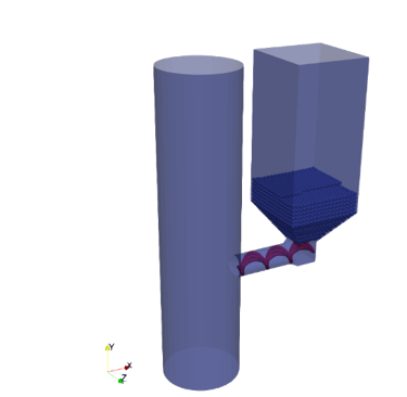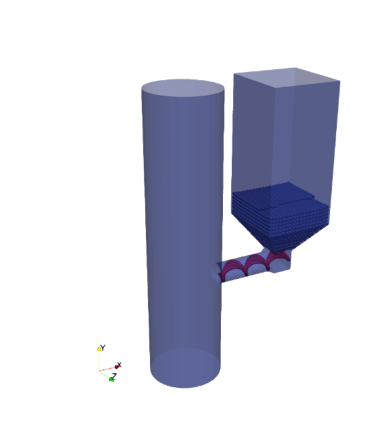 Geometry: The screw feeder consists of a cylindrical hopper with a screw rotating at its center. Granular particles are initially arranged in a structured array inside the hopper.